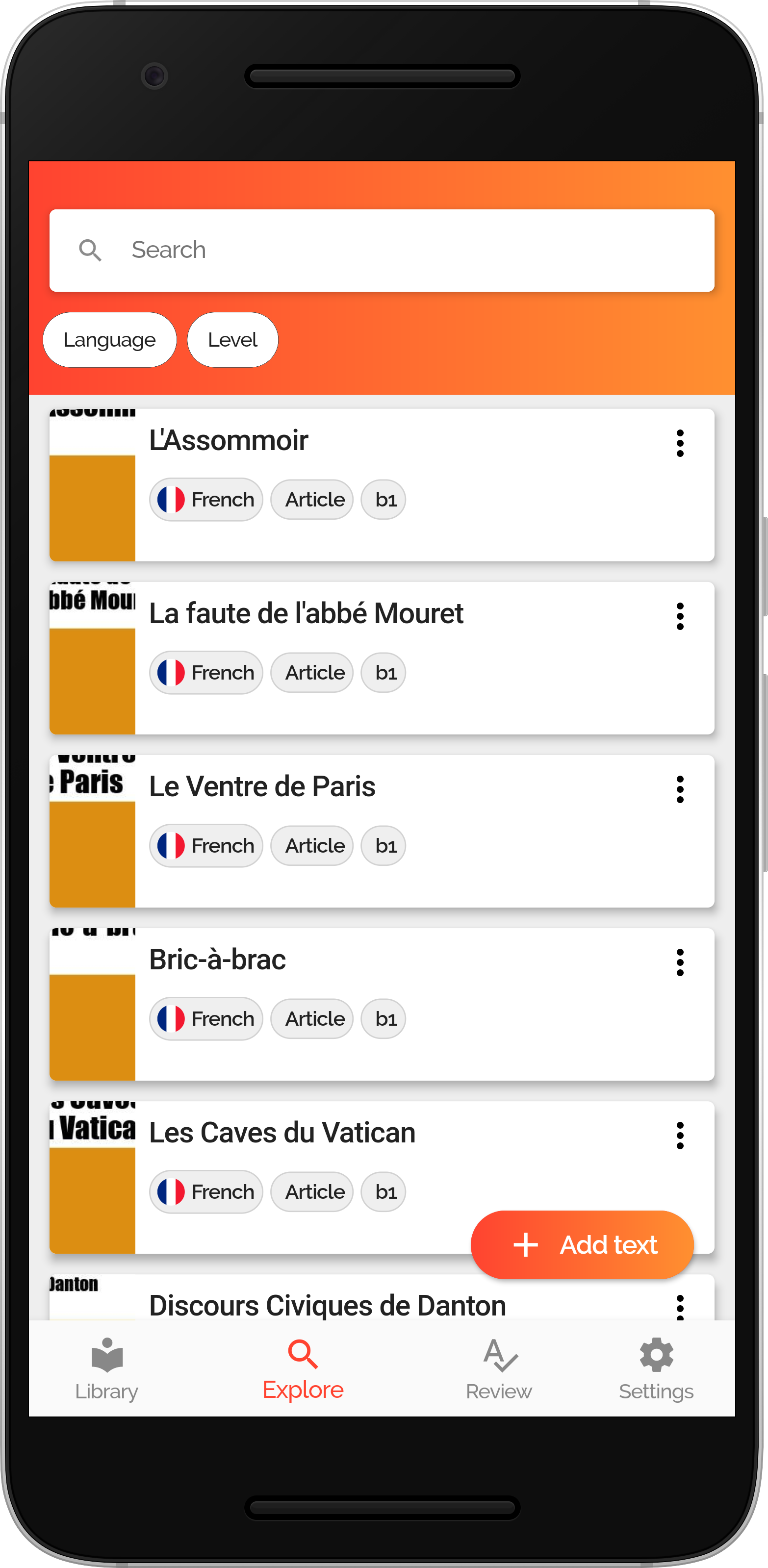 Start learning a new language today. Upload your own articles, texts or videos and learn with content you enjoy.